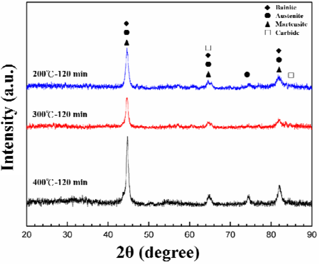 The XRD patterns of the specimens produced under different salt-bath conditions after austempering at 1080 °C-30 min, are shown in Figure 5 and Figure 6. All the specimens shown in the figure have a bainite matrix, M7C3 carbide, and retained austenite combining martensite, while the specimen produced at an austempering temperature of 200 °C had more martensite phases [8,15,16]. Figure 5 shows that the retained austenite content of the specimen produced at a salt-bath temperature of 400 °C is the highest, while Figure 6 shows that the austenite content of the specimen decreases as the austempering time increases.