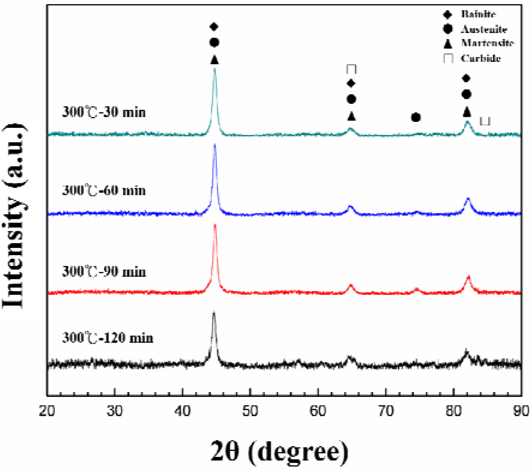 XRD of austempered specimen (1080 °C-30 min) with a salt-bath temperature of 300 °C and different salt-bath time.