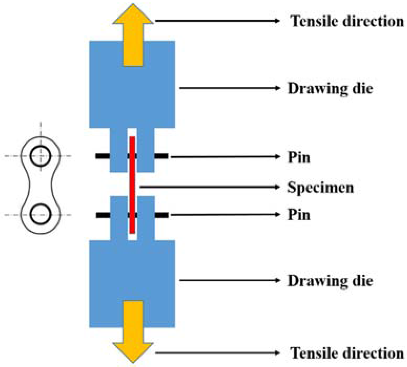 Figure 7 is the schematic diagram of the tensile test method in this study we use two pins to insert into the double-loop type thin plate specimen and vertical. Figure 8 shows a comparison of the tensile properties obtained with different salt-bath temperatures. The tensile properties of the 300 °C specimen are significantly better than those of the other specimens. The main reason for this is that the austempering temperature of 200 °C is too low for complete austempering and thus the matrix also contains martensite, which increases the brittleness of the material [5,17,18]. The 400 °C specimen has more retained austenite, which results in lower tensile mechanical properties. In the hardness tests, the 200 °C specimen had greater hardness because of the martensite inside the matrix [2,19], while the other specimens had an HRA of about 76.