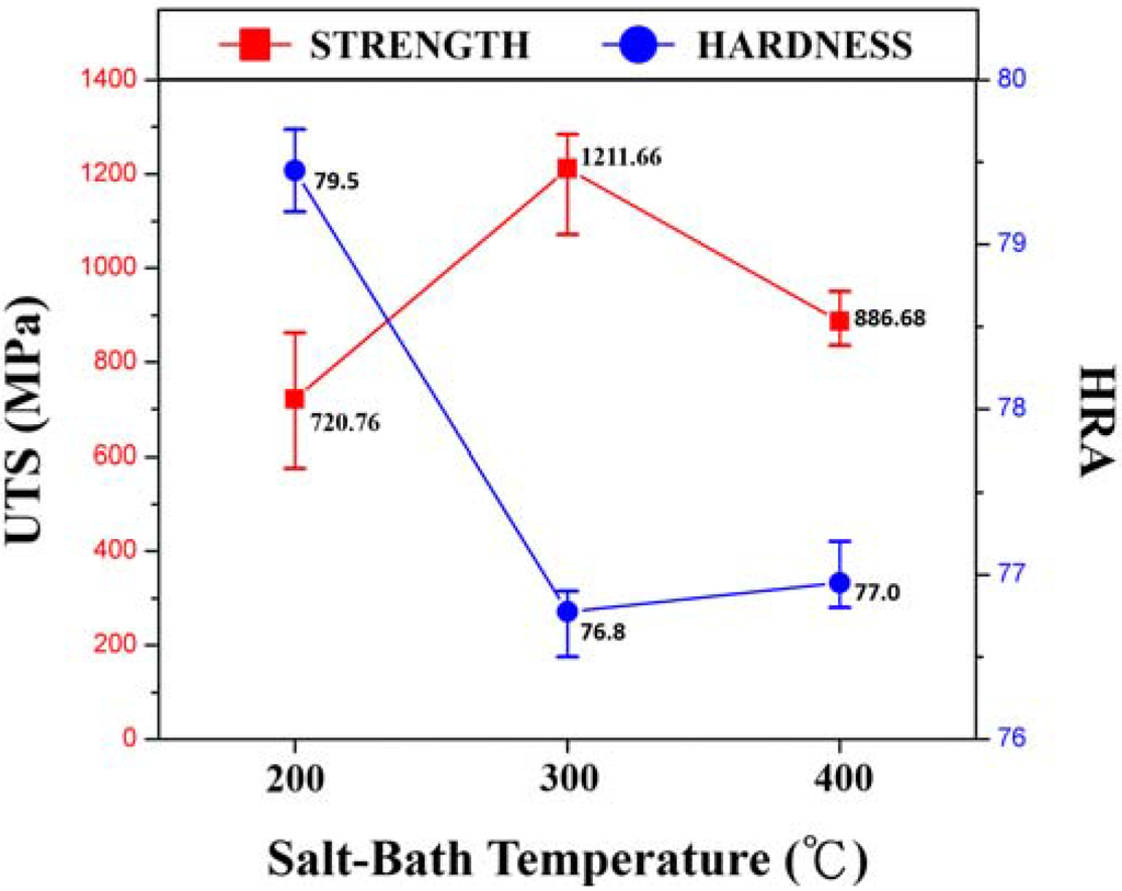 The mechanical properties of the austempered specimens (1080 °C-30 min) with a salt-bath time of 120 min and different salt-bath temperatures.