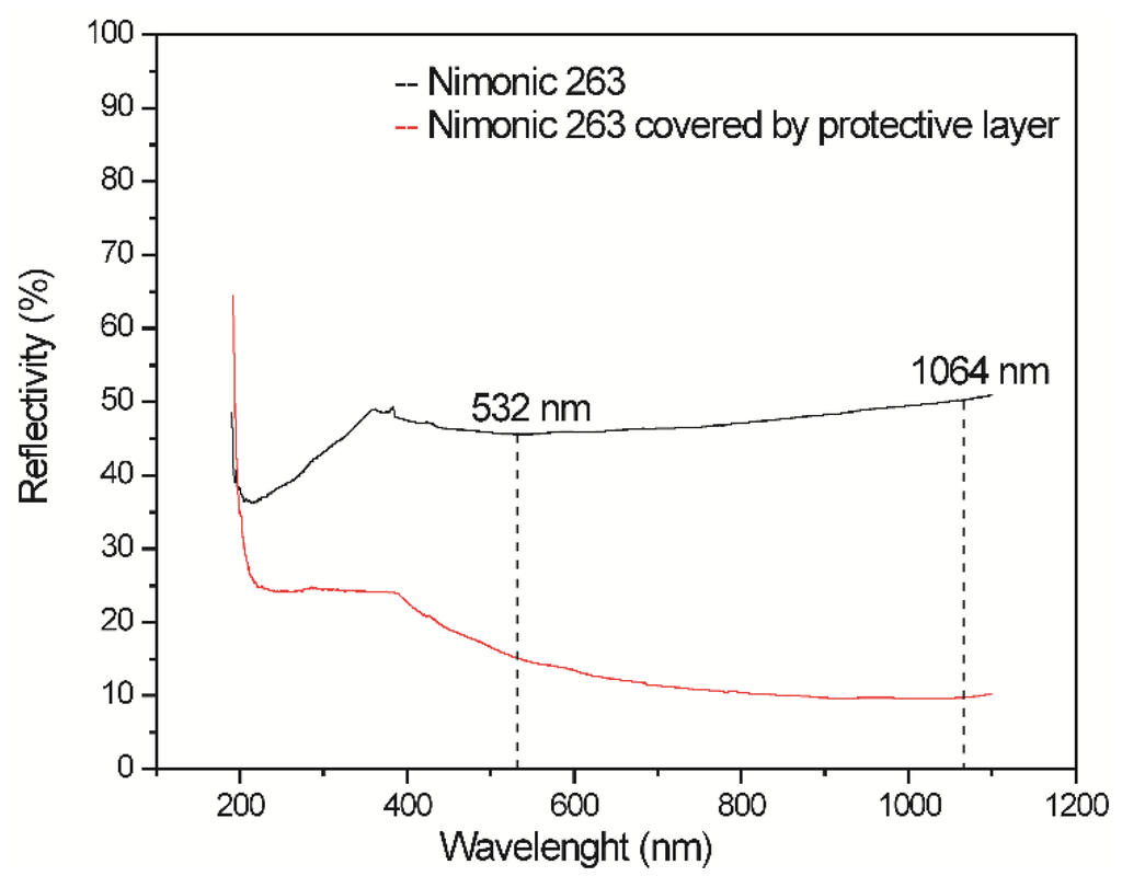 It is important to determine how protective layer influences the value of absorptivity/reflectivity of the sample surface for light wavelengths that were used in this experiment (532 nm and 1064 nm). Comparative reflectance spectra and the results for Nimonic 263 surface with and without protective paint are presented in Figure 3 and Table 3.