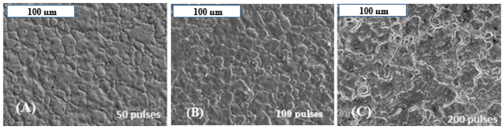 At 1064 nm laser action, the pulse energy values were 2 mJ, 10 mJ and 15 mJ, and the number of pulses 50, 100 and 200. The finest microstructure was obtained at pulse energy of 10 mJ (presented in Figure 4), as pulse energy of 15 mJ induced not only mechanical but thermal changes as well. Increase in the pulse energy leads to decrease of the grains size.