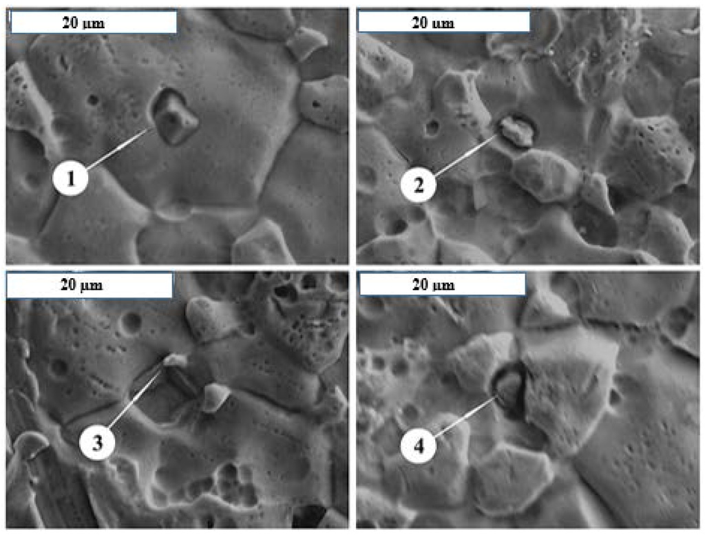 Table 5 presents EDS results of the whole area shown in Figure 7a, and the spectrums presented in Figure 7b. In Figure 7a, degasation is noticed in some of the grains, and EDS analysis shows the higher content of carbon and oxide due to mechanism of the process. The presence of the triple grain boundary is presented in Figure 7b. The EDS results presented in Table 5 show the high content of Ti and Mo and, along with the morphology, suggest that the (TiMo) carbides are formed. The size of these carbides is up to 2 µm. At the grain boundaries the carbides are in the favorable form of chain, with higher hardness [34].