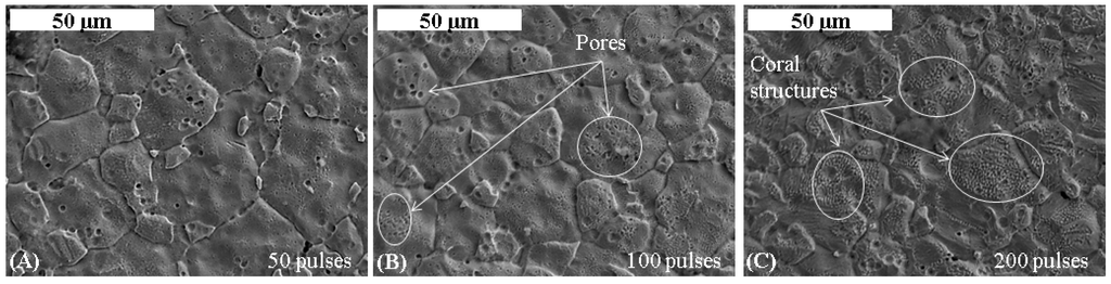 LSP is performed with the action of laser light at 532 nm wavelength, as well. Figure 6 shows the microstructure of Nimonic 263 obtained by the stated wavelength, 25 mJ energy and 50, 100 and 200 number of accumulated pulses, respectively. In contrast to the 1064 nm wavelength, the pulse energy of 2 mJ, 10 mJ and 15 mJ could not be applied with the wavelength of 532 nm, as it does not produce sufficient fluence required to make changes in a surface layer. When the pulse energy is increased, the pores start to form, while the increase in the number of applied pulses results in a “coral” structure, as shown in Figure 6. The grain boundaries are more pronounced with higher number of applied pulses. Unlike the treatment with the wavelength of 1064 nm, melting did not occur after 200 pulses (Figure 6c).
