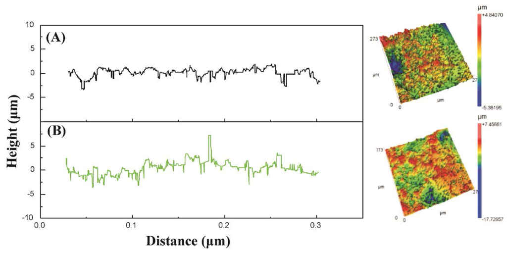 Two-dimensional profiles and 3D maps of the areas after LSP processing at both wavelengths and after 50 accumulated pulses are presented in Figure 9. The noncontact profilometry measurements are based on the interference between white light reflected from the sample surface and the reference surface.