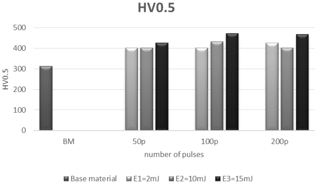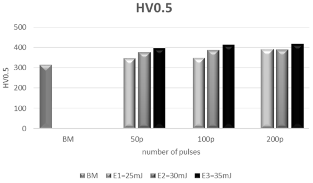 Hardening effect is expected to be present after surface treatment by the laser light. The results of microhardness measurement (HV0.5) for the base material (BM) and the material treated by laser process parameters: wavelength at 1064 nm, E1 = 2 mJ, E2 = 10 mJ and E3 = 15 mJ, and the number of pulses 50, 100 and 200, are given in Figure 11.