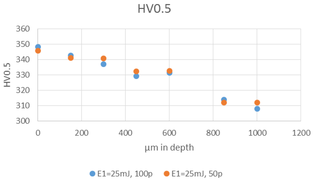 Figure 12 presents the microhardness values of the material treated by the following laser process parameters: wavelength at 532 nm; E1 = 25 mJ, E2 = 30 mJ and E3 = 35 mJ; and the number of pulses 50, 100 and 200. Comparing Figure 11 and Figure 12, it can be concluded that laser beam wavelength does not significantly affect the microhardness values. Figure 13 shows the microhardness measurements of areas treated by laser energy of 25 mJ and number of pulses 50 and 100, at wavelength 532 nm. As can be seen in the graph, the microhardness value slightly decreases in depth as the influence of shock waves is fading away.
