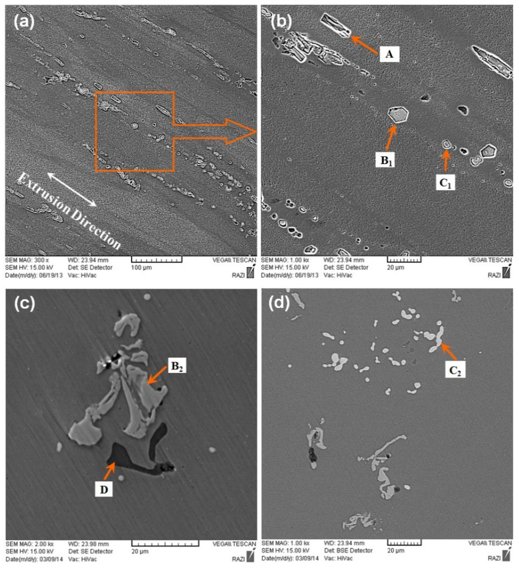 Figure 1 shows the scanning electron microscope (SEM) micrographs of the as-received 7075 aluminum alloy. It can be observed (Figure 1a,b) that the microstructure of the alloy consists of directed α-Al grains and some precipitate particles in the direction of the initial extrusion process. It is worth noting that Zn, Cu, and Mg are the main alloying elements in 7075 alloy which play an important role in the formation of precipitates. In the 7xxx series of aluminum alloys, when the Zn:Mg ratios are between 1:2 and 1:3, MgZn2 (η) precipitates are produced at ageing temperatures below 200 °C and are the main strengthening factor in 7xxx alloys [18]. The dimensions of these precipitates are only a few tens of nanometer which can only be revealed by TEM technique. Considering Figure 1b–d, EDS analysis results of the coarse precipitate particles, as summarized in Table 2, suggested them to be (I) Al2CuMg intermetallic phase (which is usually denoted as S-phase) with relatively smooth corners (C1 and C2 in Figure 1b,d), (II) Al6(Cu,Fe) intermetallic phase which is also known as Al23Fe4Cu or α(FeCu) with polygonal (B1 in Figure 1b) or irregular (B2 in Figure 1c) shapes, (III) Al7Cu2Fe (β) phase with irregular shapes which have been elongated along the extrusion direction (A in Figure 1b) and (IV) dark Mg2Si precipitates with irregular shapes (D in Figure 1c). Considering the EDS analysis results, Fe-rich intermetallic phases (Al6(Cu,Fe) and Al7Cu2Fe) also contain small amounts of manganese which can be substituted for iron as a result of their close atomic radii.