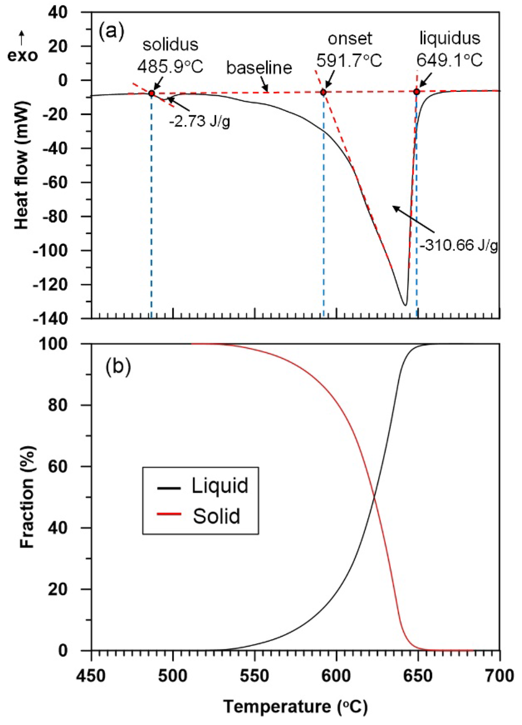 (a) Differential scanning calorimeter (DSC) curve of 7075 Al alloy at a heating rate of 10 °C/min; (b) solid and liquid volume fraction versus temperature derived from the DSC curve.