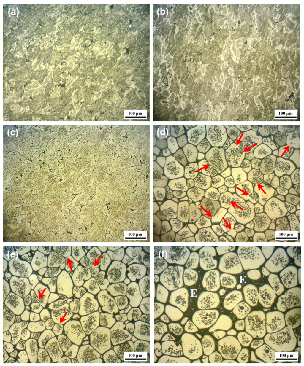 During the isothermal heating period of 15 min to 25 min, the interconnection between the solid grains reduced and the grains gradually became spherical (Figure 3e). The spheroidization mainly occurred during this stage. During the period of 25 min to 35 min, the liquid phase obviously increased (comparing Figure 3e,f) which finally led to intergranular formation of thick eutectic regions following 35 min heating of the sample (indicated by the E letter in Figure 3f). This is evidenced with the eutectic phase becoming the predominant feature at grain boundaries after semi-solid soaking (Figure 4b). It can be expected that the coarsening of spherical grains will occur with raising of the heating time over 35 min.