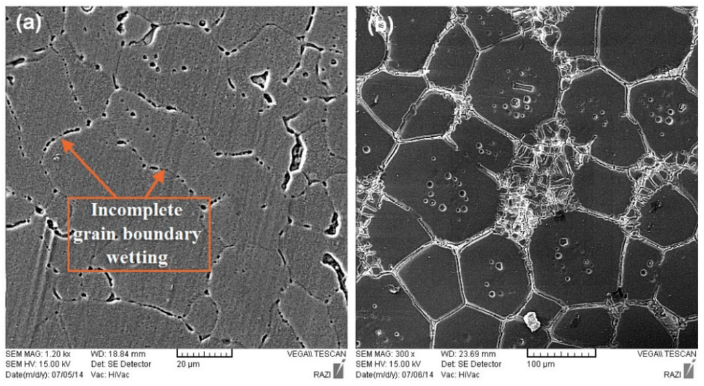 Ostwald ripening is a diffusion controlled mechanism and acts as the dominant mechanism at high liquid volume fractions i.e. high heating temperatures and long holding times. This mechanism is less effective in particle growth but has a great influence on the spheroidization of solid grains. In contrast, the coalescence mechanism which needs shorter holding times and a small amount of liquid fractions, is more effective in grain growth and has a minor effect on the spheroidization process [25,26,27].