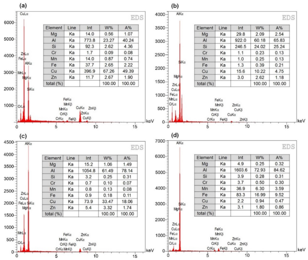 Scanning electron microscope (SEM)/energy dispersive spectroscopy (EDS) analysis results of selected constituent particles highlighted in Figure 1.