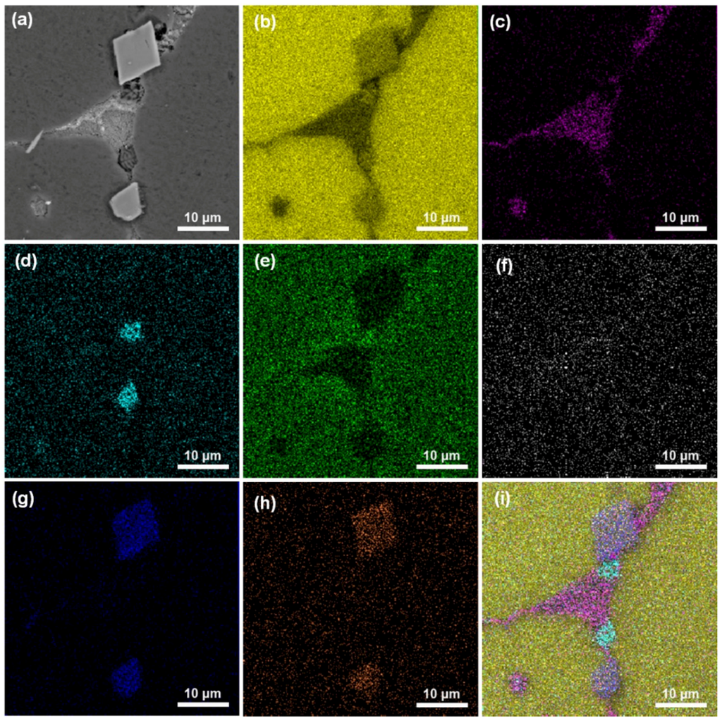 (a) SEM image; (b) Al; (c) Cu; (d) Si; (e) Mg; (f) Zn; (g) Fe; (h) Mn; (i) Al Fe Si Mn Cu X-ray image analysis of a compressed sample isothermally heat treated at 600 °C for 25 min.