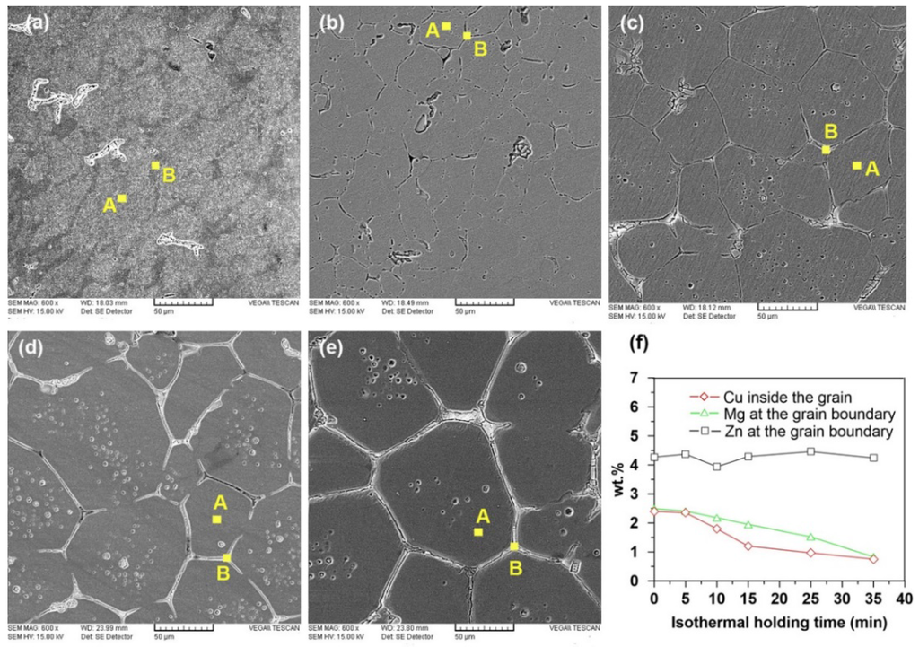 Figure 9a–e shows SEM images of compressed samples heat treated at 600 °C for 5–35 min. Variations of the main alloying elements of 7075 alloy (i.e. Cu, Zn, and Mg) at the grain boundaries and grain centers in these samples are also demonstrated in Figure 9f. The EDS analysis results of the grain centers and grain boundaries (Figure 9f), showed that the Cu concentration reduces within the solid grains on increasing the isothermal holding time at 600 °C. In other words, Cu segregation rises at grain boundaries with increasing holding time. Mg concentration declined at the grain boundaries on raising the holding time and no significant change was observed in Zn concentration at various parts of the microstructure.