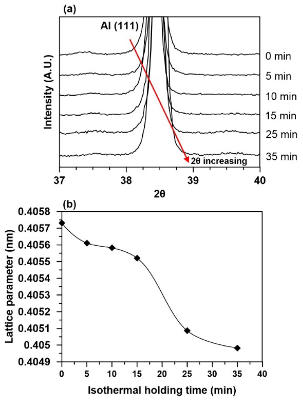 Considering that (i) Zn, Mg, Si, and Cu-bearing intermetallic precipitates (η, S and Mg2Si) are dissolved gradually on prolonging the holding time according to XRD patterns of the SIMA processed samples (Figure 5), (ii) Zn and Mg have higher solubility in Al compared with Cu and Si according to the Al-Zn, Al-Mg, Al-Cu and Al-Si binary phase diagrams [38], and (iii) no distinct peak for these elements appeared in the XRD patterns (Figure 5), it can be concluded that Zn and Mg elements are easily dissolved in α-Al, while Cu and Si significantly segregate at the grain boundaries. Since, Zn has a smaller atomic radius relative to aluminum (0.133 nm compare to 0.143 nm) [39], it can be concluded that dissolving Zn in the aluminum crystal lattice leads to reduction of the lattice parameter of aluminum. However, dissolving Mg in Al, as a result of its greater atomic radius, can result in increase of the lattice parameter of aluminum. The shifting of the Al main peaks in XRD patterns (Figure 5) to higher angles, as shown in Figure 10a for (111) reflection of the aluminum matrix, revealed that the lattice parameter of Al decreases on prolonging the heating time (Figure 10b) based on Bragg’s equation (nλ = 2dsinθ). It seems that dissolving Zn in Al is more effective than Mg. This may be as a result of the higher Zn content of 7075 alloy. According to Figure 10b, the lattice parameter is gently reduced with prolonging holding time to 15 min and then with further extension of the holding time to 25 min, the lattice parameter precipitously declines. Finally, further increasing of the heating time results in a gentle reduction of the lattice parameter. These observations clearly correlate with the XRD results in Figure 5. According to the XRD patterns, great amounts of η precipitates dissolve during the isothermal heating of the sample for 25 min. This results in dissolving of a higher amount of Zn atoms in the aluminum lattice and therefore leads to a significant decline of the lattice parameter.