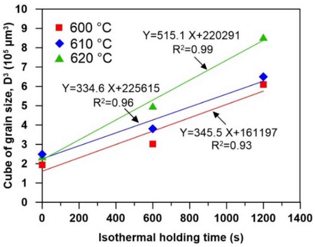 Variations of the cube of average globule size versus isothermal holding time of compressed samples at heating temperatures of 600–620 °C where R2 is the regression coefficient.
