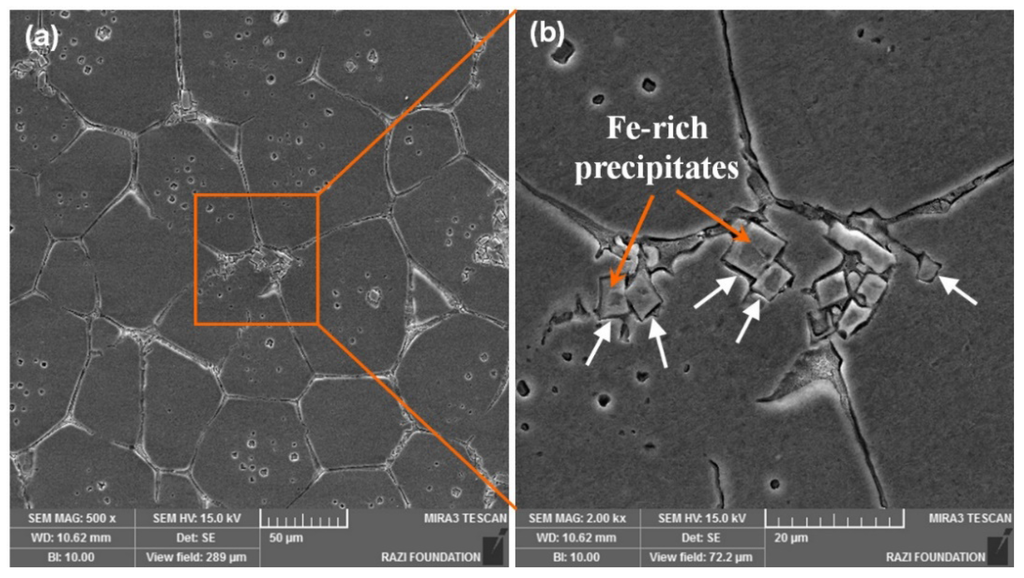 The Fe-rich intermetallic precipitates have higher solution temperatures and are usually stable over 600 °C [31]. Microstructural observations revealed that the Fe-rich intermetallic particles, shown in Figure 6, precipitate at grain boundaries during partial remelting. Precipitation of these particles at the grain boundaries has a great influence on pinning of the grain boundaries movement. Therefore, it may cause the retardation of the particle growth and coarsening during the isothermal treatment. This is discussed in more detail in Section 3.5.