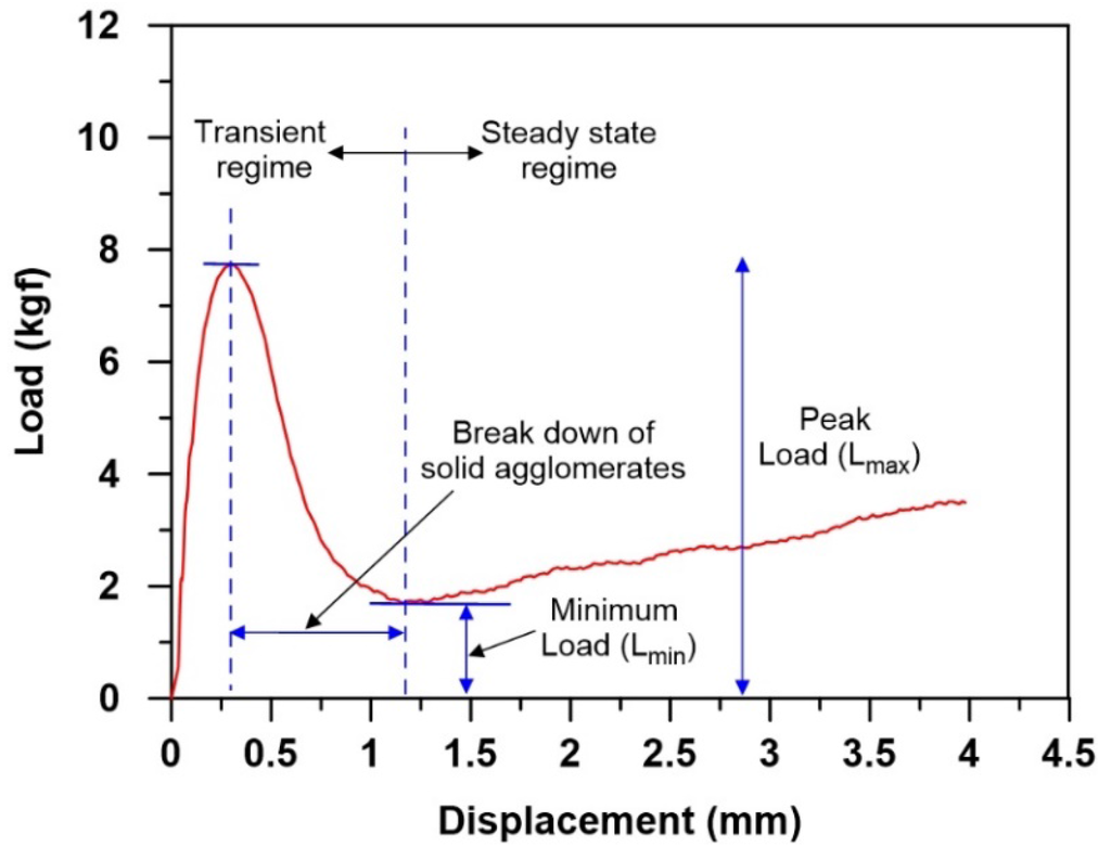Figure 15 shows a typical load-displacement curve obtained from the hot compression experiment. As it can be observed, the load rises to a maximum (Lmax) and then decreases to a minimum value (Lmin). The thixotropic flow behavior consisted of a transient regime and a steady state regime, as shown in Figure 15. Semi-solid alloys with an equiaxed microstructure are considered as deformable semi-cohesive granular solids saturated with liquid [44]. The solid grains are partially interconnected by unwetted grain boundaries and liquid fills the interstitial spaces. Large deformation results in the destruction of some solid grain boundary bonds to allow grains to move freely and rearrange through sliding and rolling. The cohesion at the grain level reflects the strength of unwetted grain boundaries and results in a flow resistance. With further deformation breakdown the solid agglomerates, the load (stress) decreases to a steady state level.