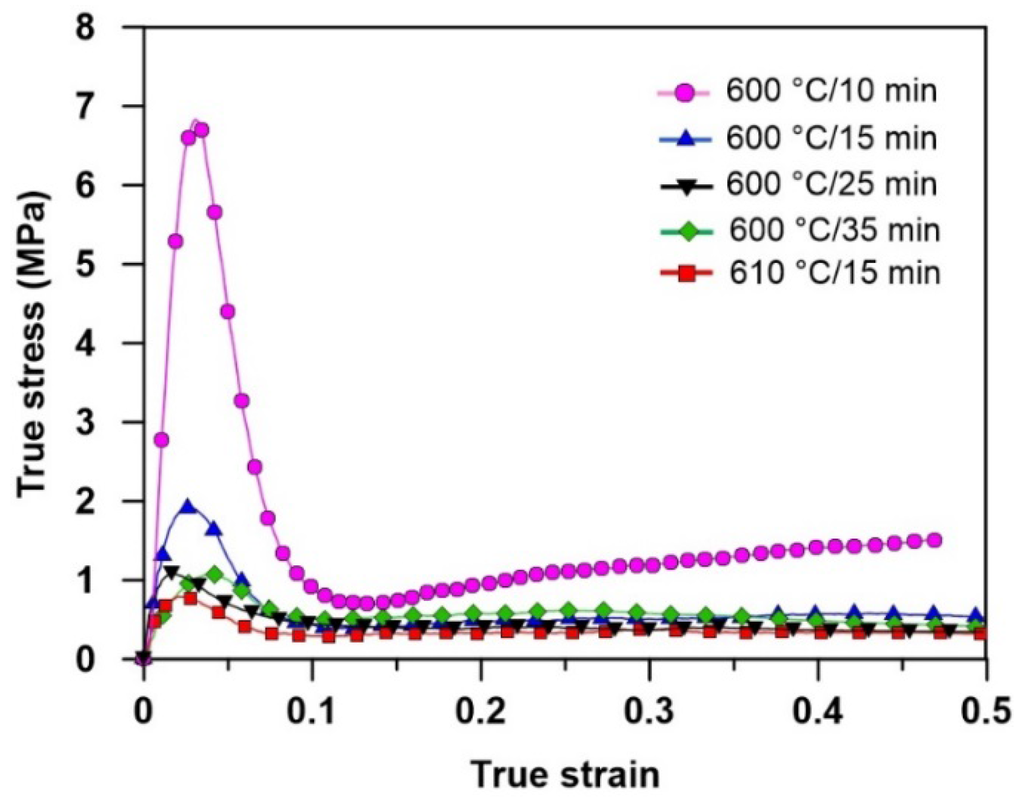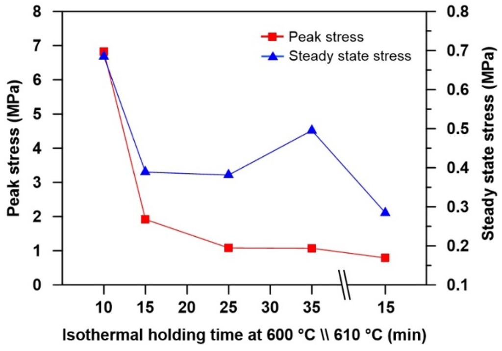 The stress-strain curves obtained from the SIMA processed 7075 samples with different initial microstructures after hot compression at 600 °C (for the SIMA samples isothermally treated at 600 °C for 10–35 min) and 610 °C (for the SIMA sample isothermally treated at 610 °C for 15 min) are shown in Figure 16. The stress exhibits a maximum value at a relatively low strain in all samples. The strain at the peak stress varies between 0.01 and 0.04. The peak stress then drops to a steady state value, typically at a strain of 0.1–0.18. The stress at the steady state shows no significant change with strain. Figure 17 shows the variation of the peak and steady state stresses for the SIMA processed samples with different initial microstructures. As is evident from Figure 16 and Figure 17, the sample semi-solid treated at 600 °C for 10 min exhibits the highest peak and steady state stresses. On increasing the isothermal holding time to 25 min at 600 °C, which results in a coarser and more spherical solid grains in the initial microstructure (see Figure 12), both the peak and steady state stresses decreased significantly. The peak stress showed a slight increase while a considerable increase in the steady state stress was observed with further increase of the holding time to 35 min in the SIMA process. Moreover, the increase of the deformation temperature had a great influence on the stress-strain curve and resulted in a decrease of thixotropic strength, as is observed for the sample semi-solid treated at 610 °C for 15 min.