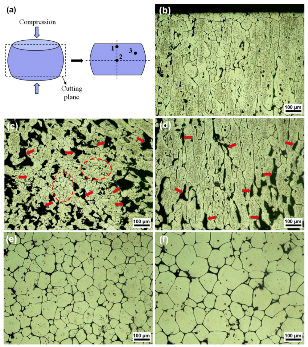 (a) Schematic of a hot compressed SIMA sample showing compression direction; Optical micrographs of (b) region 1; (c) region 2; (d) region 3 of SIMA sample processed at 600 °C for 10 min; region 2 of SIMA sample processed at 600 °C for (e) 25 min; (f) 35 min after hot compression at 600 °C.