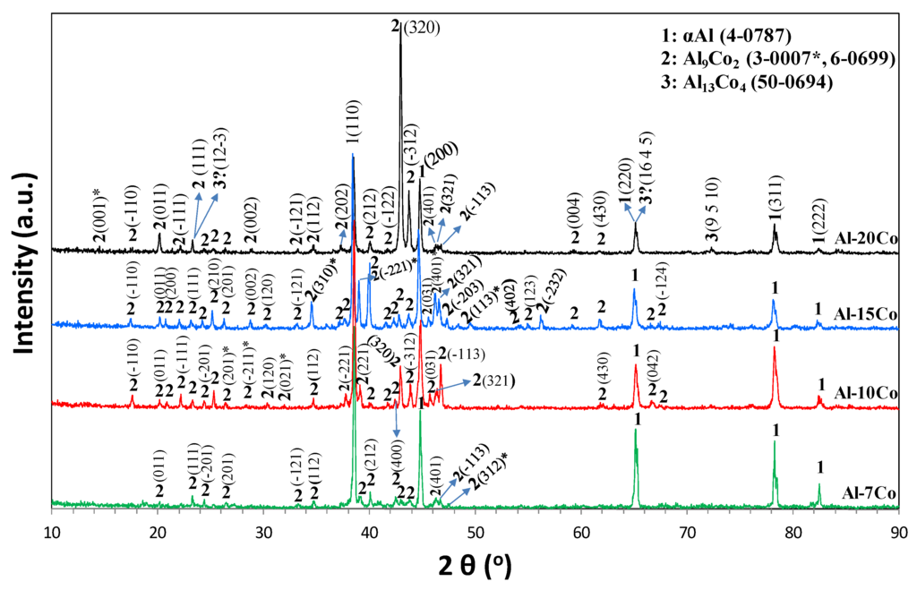 Figure 1 illustrates the XRD patterns of the fabricated Al-Co alloys. All specimens exhibit similar patterns that reveal the presence of αAl and Al9Co2. The increase in the Co content has led to an increase in the relative intensity of the peaks corresponding to Al9Co2 (towards the peaks of Al). At the composition of Al-20 wt.% Co, Al9Co2 has become the prevailing phase in the alloy. There is a possibility of a minimal presence of Al13Co4 in the 20 wt.% Co alloy. The presence of Al13Co4 cannot be confirmed on the basis of XRD only, since peaks that can be assigned to Al13Co4 appear at angles, where Al9Co2 and Al also present diffraction peaks, as seen in Figure 1. A minor peak at 2θ = 72.32° can be assigned solely to Al13Co4.