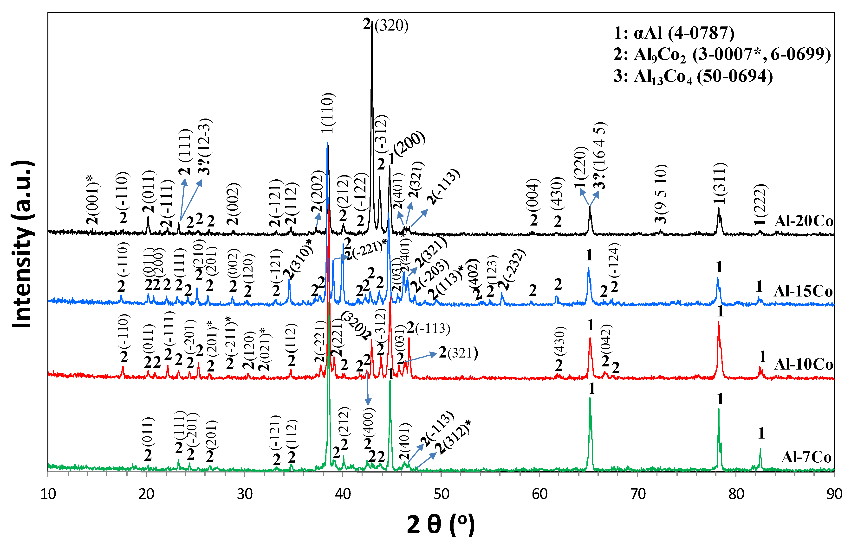 XRD patterns of the Al-Co alloys (7, 10, 15, 20 wt.% Co).