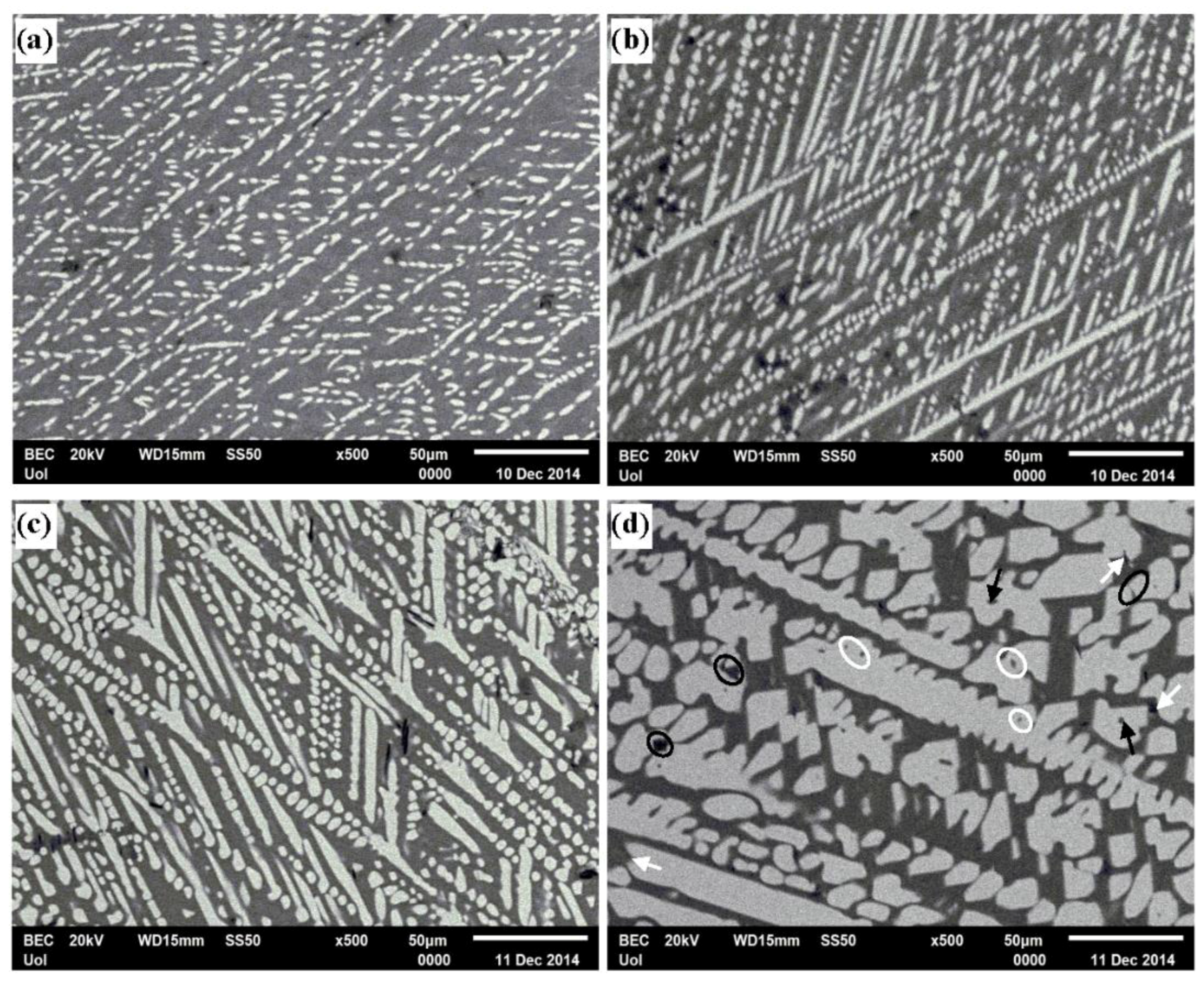 Microstructure of the alloys, as fabricated (BSE mode): (a) Al-7wt.% Co; (b) Al-10 wt.% Co; (c) Al-15 wt.% Co; (d) Al-20 wt.% Co; white outlined ellipses: pores at the intersections of dendrites and dendrite arms; black outlined ellipses: narrow and closed gaps in the matrix between Al9Co2 particles; white arrows: pores, microdefects at sharp points of Al9Co2 particles; black arrows: pores in the middle of Al9Co2 phase.