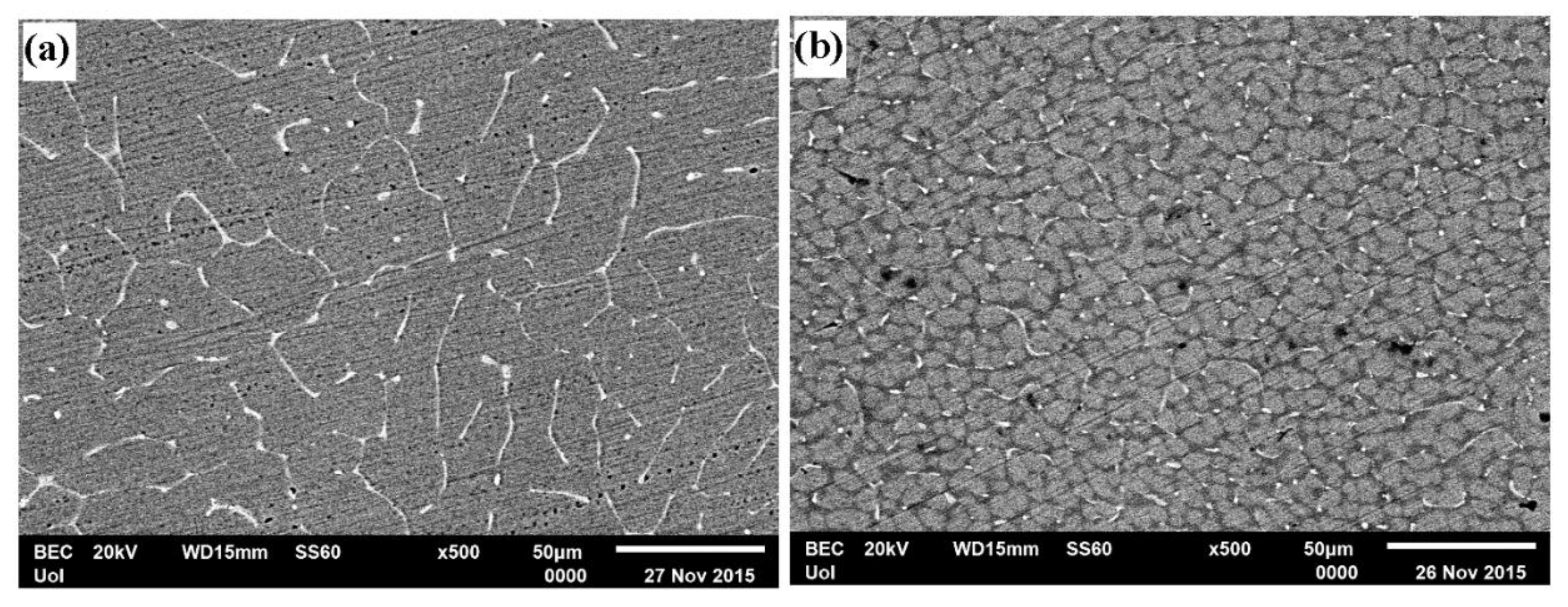 Microstructures of CP-Al produced by (a) stir casting of Al1050-H14 and (b) vacuum arc remelting of Al1050-H14.