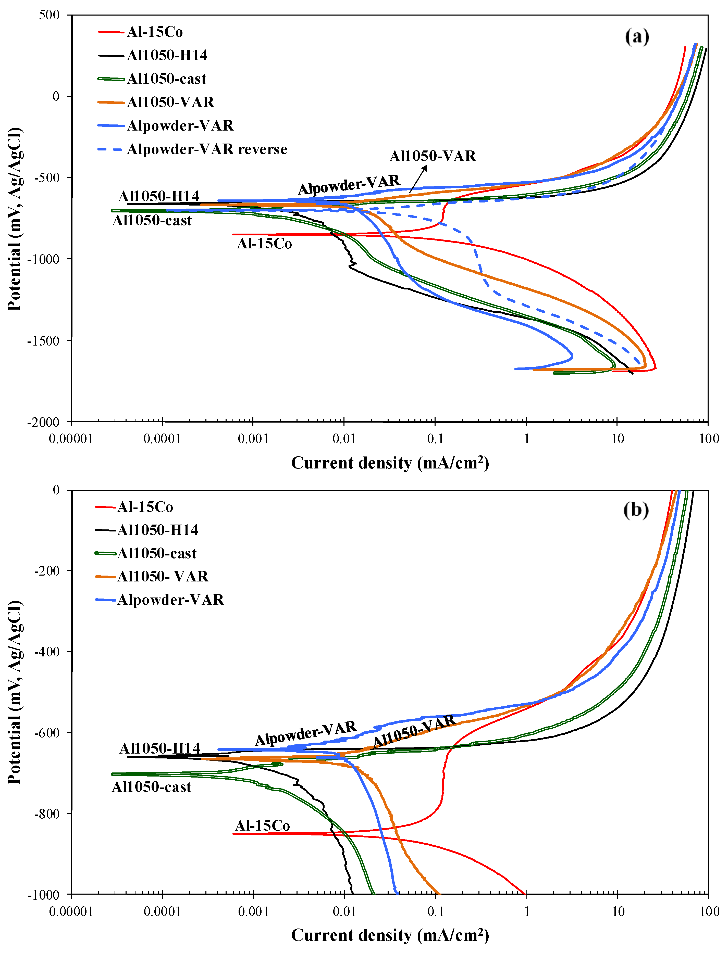 Potentiodynamic polarization performance of CP-Al produced by VAR of CP-Al powder (Alpowder-VAR), VAR of Al1050 sheet (Al1050-VAR), casting of Al1050 (Al1050-cast), cold rolling (Al1050-H14) and Al-15 wt.% Co produced by VAR (3.5 wt.% NaCl, 25 °C); (a) full view; (b) magnified view at a selected range of potentials.