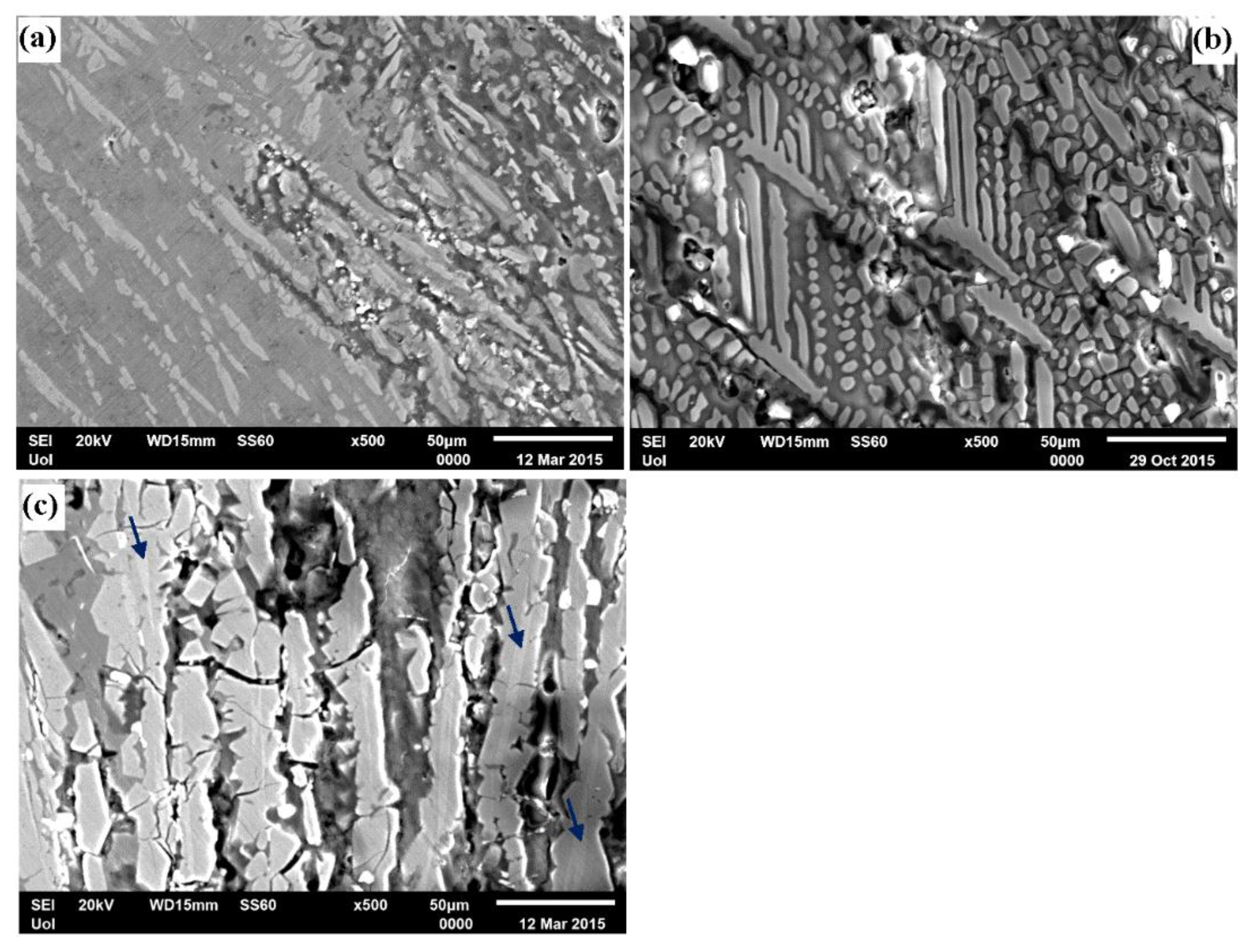 Cross sections (SE mode) of (a) Al-7 wt.% Co, (b) Al-15 wt.% Co and (c) Al-20 wt.% Co after cyclic polarization (3.5 wt.% NaCl, 25 °C); the blue arrows in Figure 6c point at the Al13Co4 phase.