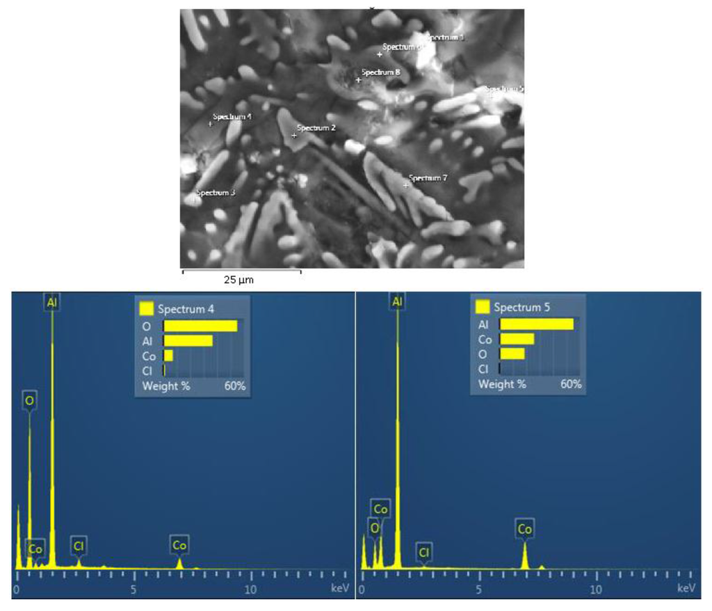 (f) The periphery of the Al9Co2 phase has also been subjected to oxidation (Figure 7-spectrum 5, Figure 8-line scan, Figure 9-line scan and Figure 10-elemental mapping). Previous work [29] has shown that oxidation of Al9Co2 in 3.5 wt.% NaCl is possible at potentials higher than −623 ± 40 mV vs. Ag/AgCl, namely, stage 3-potentials. Furthermore, Alarcon-Villaseka et al. [22] have proved, by using both experimental methods and first principles calculations, that the formation of Al2O and Al2O3 on the (001) surface of Al9Co2 upon oxidation is to be expected. They also noted that, even if the topmost layer of the (001) surface of Al9Co2 is a pure aluminum termination, the sublayer contains cobalt atoms, which strongly influence the values of the adsorption energies and surface reactivity.