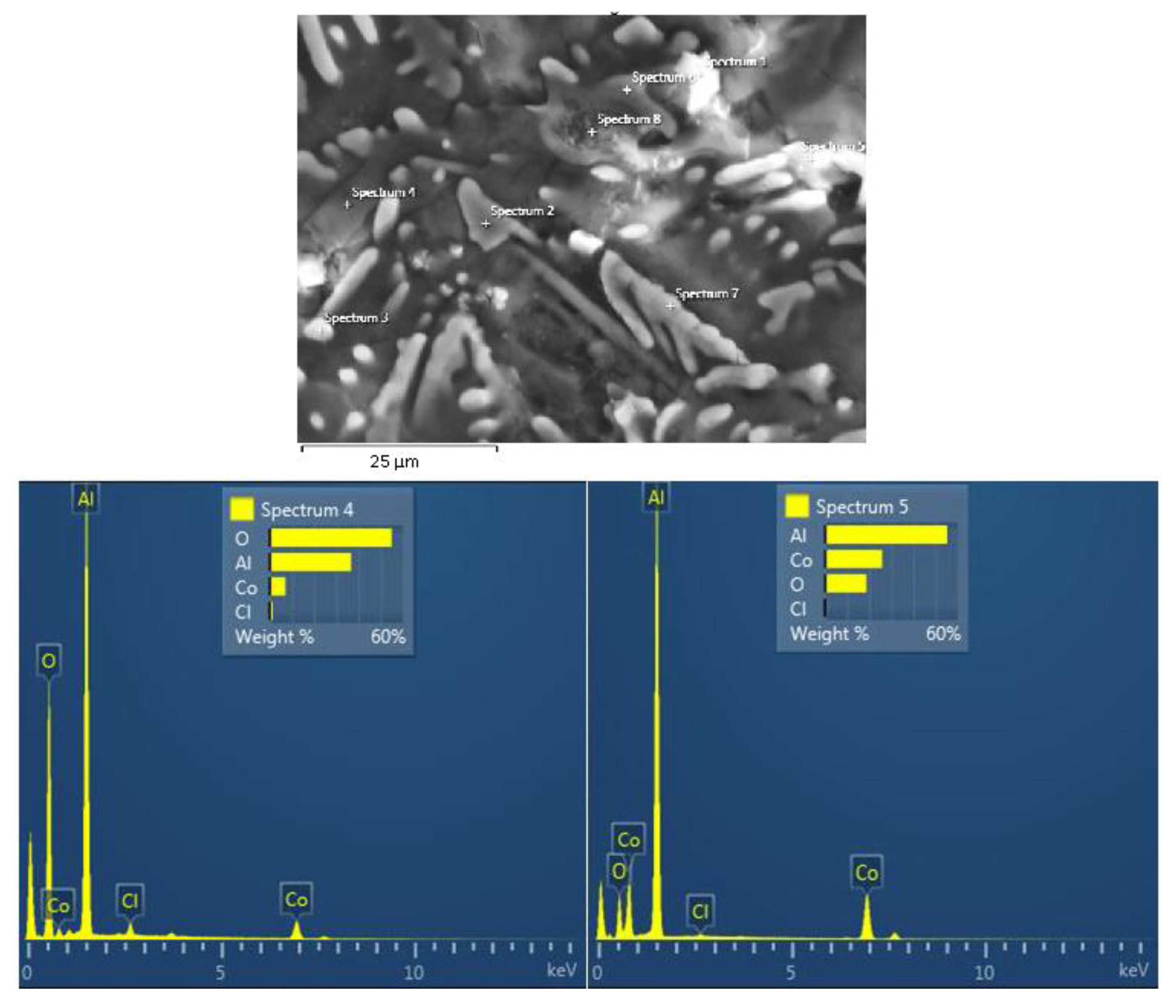 (e) a surface layer has been formed on the (Al) matrix (Figure 7-spectrum 4, Figure 10-oxygen map), confirming that current stabilization stage 2 is due to passivation of Al. EDX spectrum 4 in Figure 7 reveals the presence of small quantities of Co in the surface film of the (Al) phase. As mentioned in the Introduction, the incorporation of transition metals (TM) in the surface film of aluminum enhances the protectiveness of the film in crystalline Al-TM alloys [30,31,32,33] and Al-Cr-Fe CMAs [34,35]. Detection of Cl− in the EDX spectra of Al (spectrum 4) and Al9Co2 (spectrum 5) provides evidence of interaction of Cl− on the surface film of a metal, consistent with previous works [63,64].