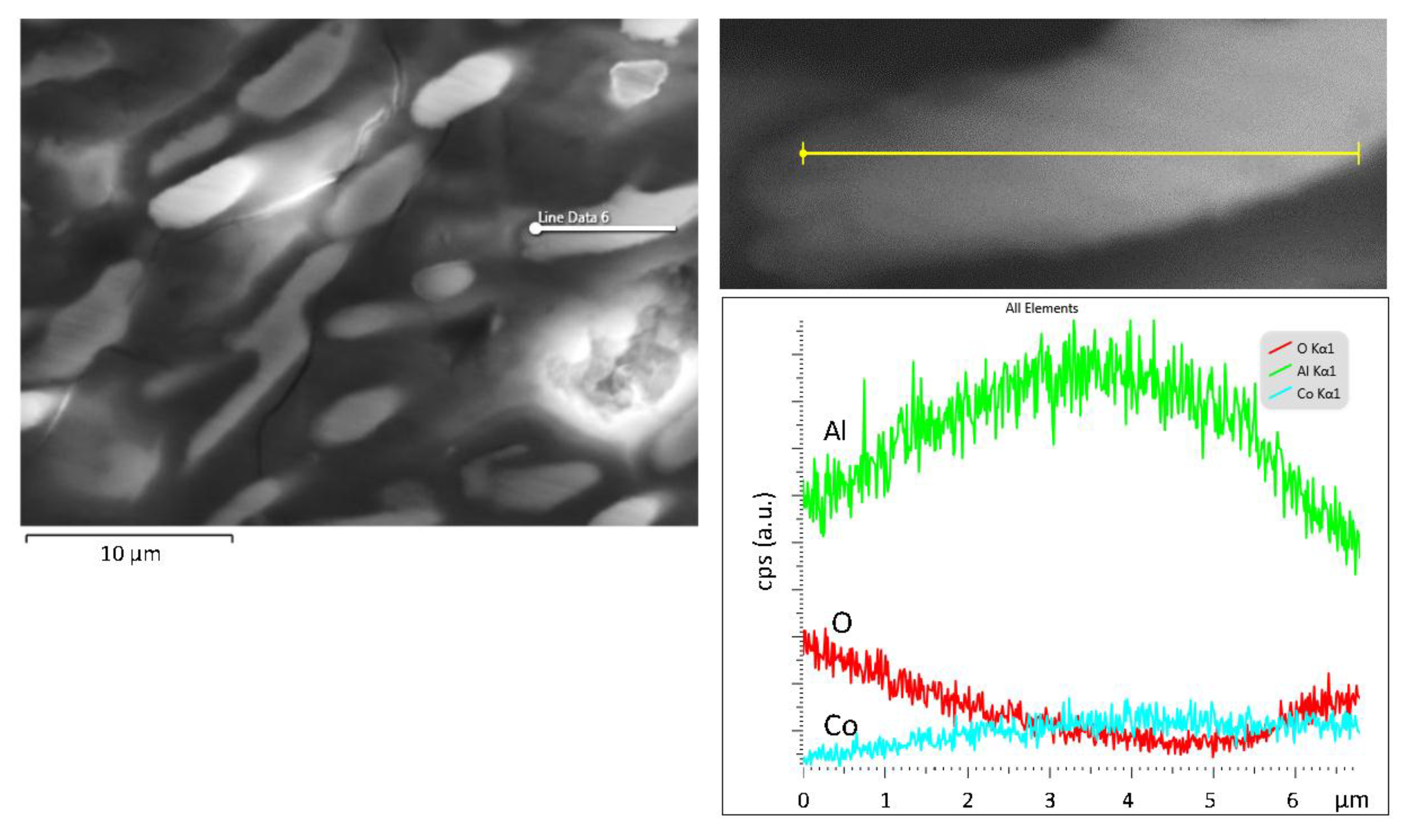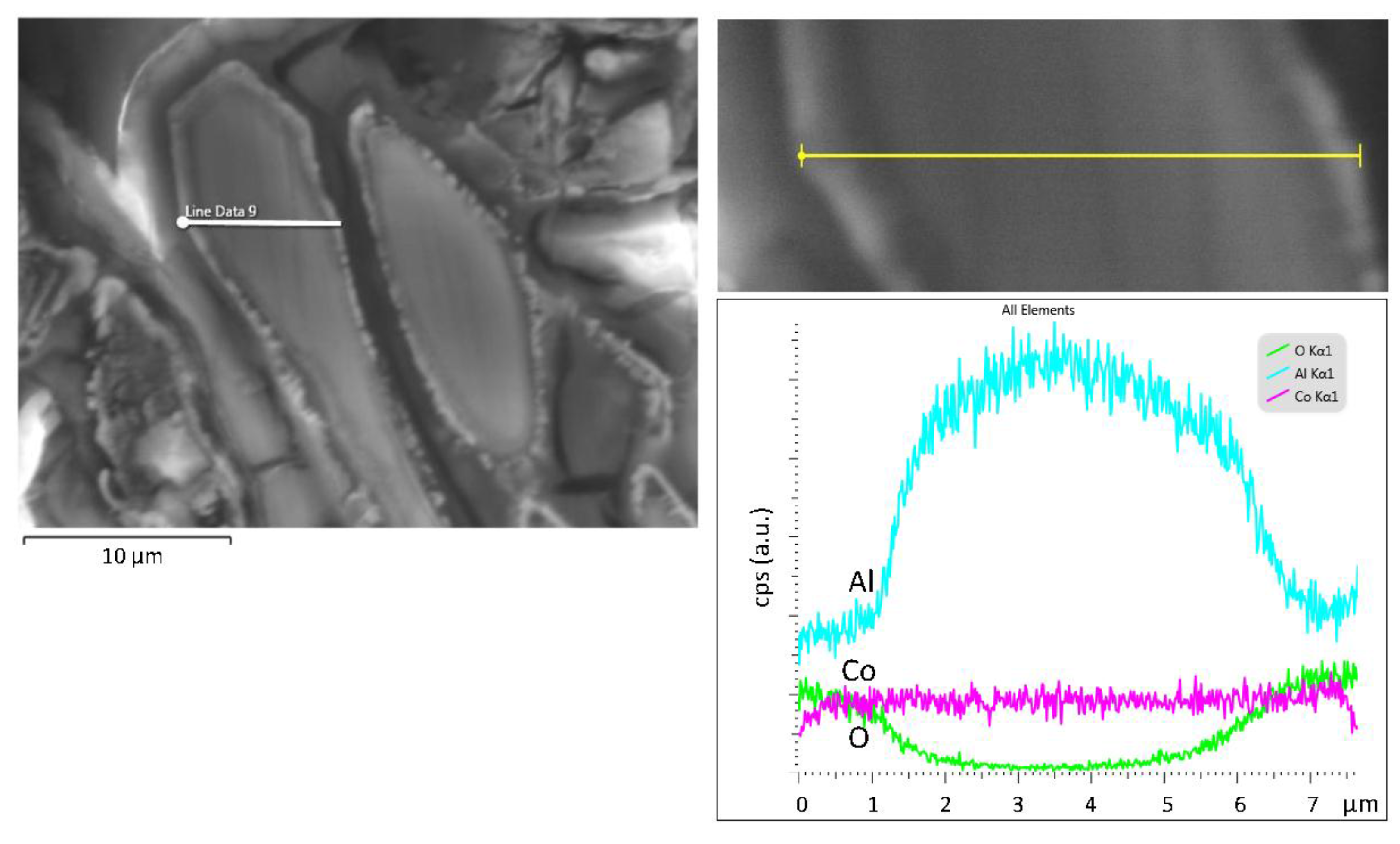 Cross-section (SE mode) of Al-7 wt.% Co after cyclic polarization (3.5 wt.% NaCl, 25 °C) and EDX line scan across a plate of Al9Co2.