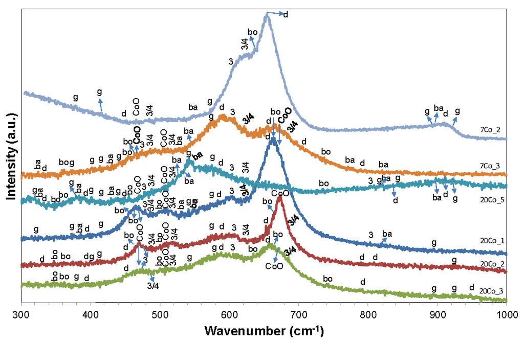 - Tang, C.W.; Wang, C.B.; Chien, S.H. Characterization of cobalt oxides studied by FT-IR, Raman, TPR and TG-MS. Thermochim. Acta 2008, 473, 68–73. [Google Scholar] [CrossRef]