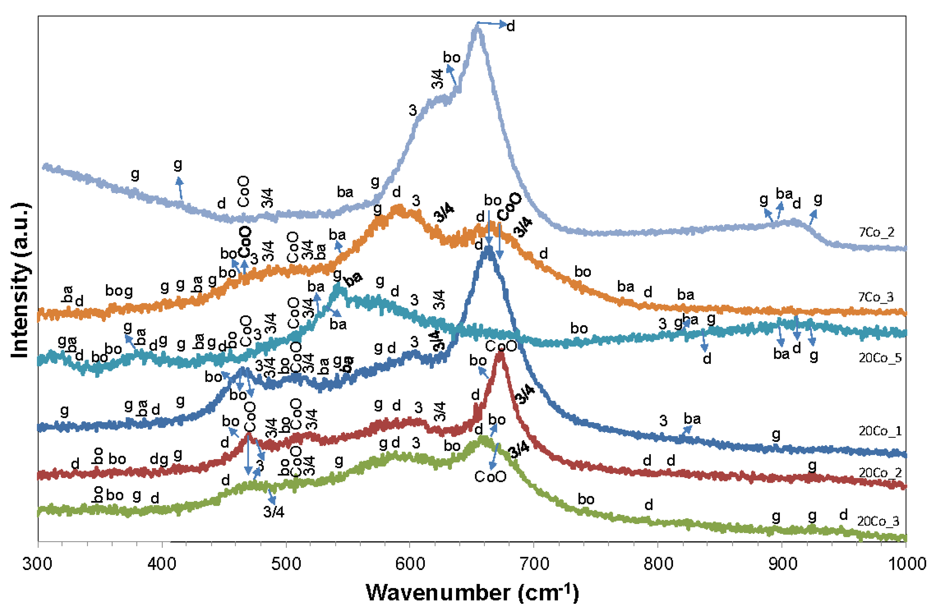 Representative Raman spectra from the surface of Al-7 wt.% Co and Al-20 wt.% Co, after cyclic polarization (3.5 wt.% NaCl, 25 °C). d: diaspore, b: boehmite, g: gibbsite, ba: bayerite, 3/4: Co3O4, 3: CoOOH.