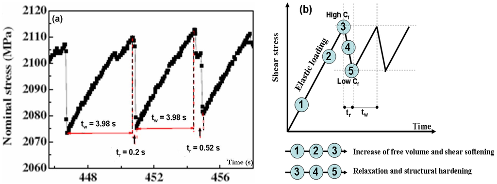 (a) Experimental stress-time curve of deformed Zr-based Bulk Metallic Glasses (BMG) showing typical serrations in time scale [24]; (b) The corresponding schematic illustration of successive serration events. Cf is the flow defect concentration (free volume content), tr is the relaxation time (the stress drop time) and tw is the waiting time (the stress increasing time).