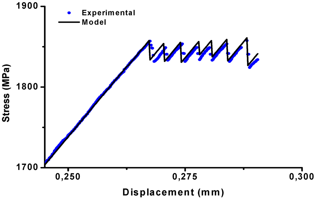 From the simulation results presented in Figure 2, it can be concluded that the simulation fits quite well to the experimental results. After a certain amount of plastic strain, slight serrations were found on the macroscopic stress-displacement curve. Almost of the adjustable model parameters obtained are physically meaningful and comparable with those found in the literature. QSTZ, Va and E are close to that obtained in references [5,27,29,30]. The value of γ0, ν0, α0 is in agreement with similar published results [32]. The Values of m, n, P1, P2 and w are comparable to those found in References [25,28].