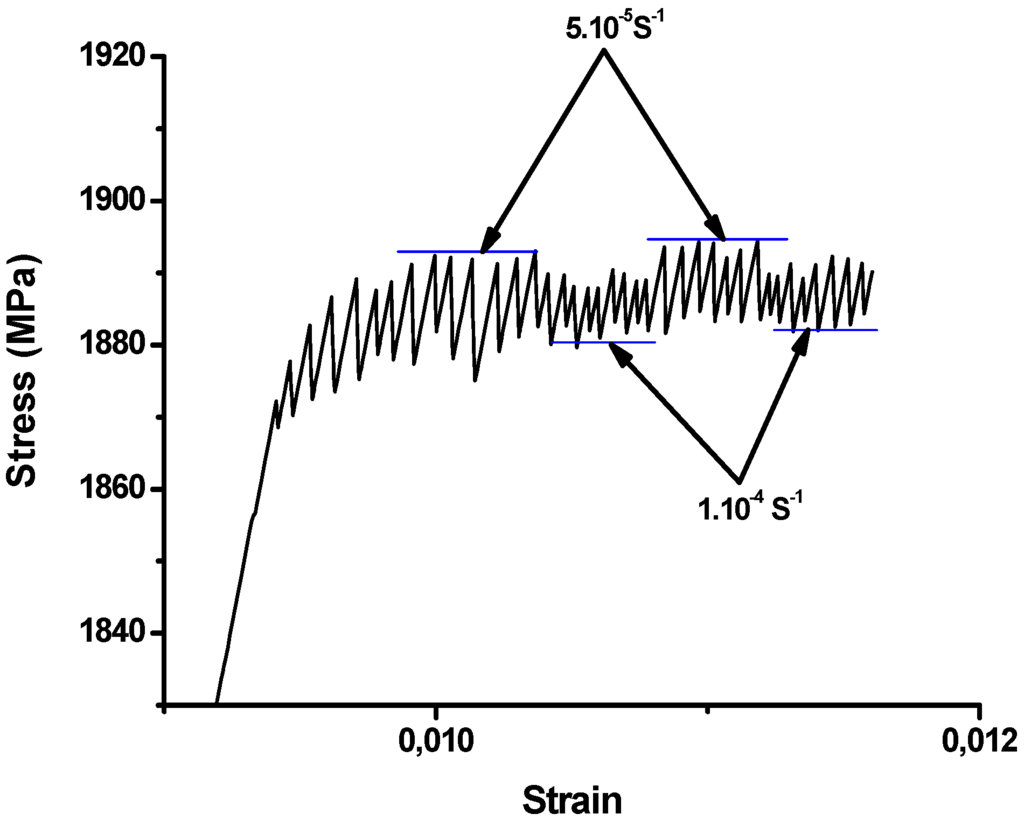 The flow stresses showed higher values at lower strain rates, giving rise to negative strain rate sensitivity which is a required condition for serrated flow deformation in a range of BMGs alloys to occur [33,34]. From the obtained results, we suggest that, if the time for the structural relaxation (diffusive free volume annihilation) within the shear bands is sufficient after a shear displacement, the yield strength is higher, but it decreases for shorter periods of time, i.e., for higher applied strain rates. In other words, according to the physical picture of our model, when the applied strain rate suddenly decreases, more time is available for the relaxation to occur between successive stress drops. This time allows for the sheared zone to annihilate more free volume. In turn, this leads to a strengthening of the shear deformed zone, or macroscopically to a higher stress resistance against flow than reached by a rapidly applied strain rate. Therefore, a higher flow stress results at lower applied strain rates. This causes a negative strain rate sensitivity which is commonly known for metallic glasses showing serrated flow (see Figure 1 in reference [34] for comparison) as well as for crystalline materials exhibiting PLC effect.