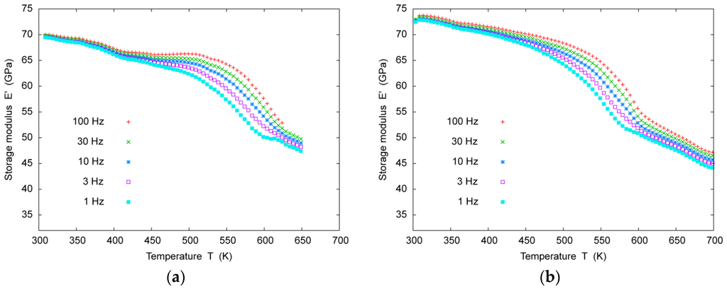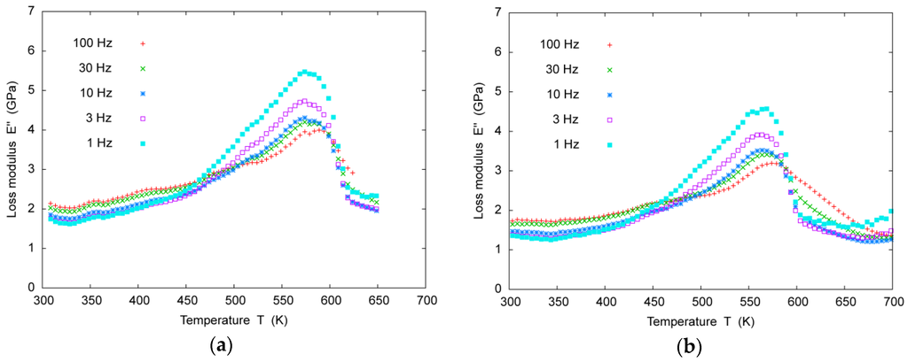 In addition, in Figure 2, a transition is observed around 473–513 K between the low temperature region where E” is smaller for lower loading frequencies and the high temperature region where E” is smaller for higher frequencies (a stiffer response in this case is expected). Finally, after the aforementioned peak, E” seems to increase again in Figure 2b, particularly for the lower frequencies.