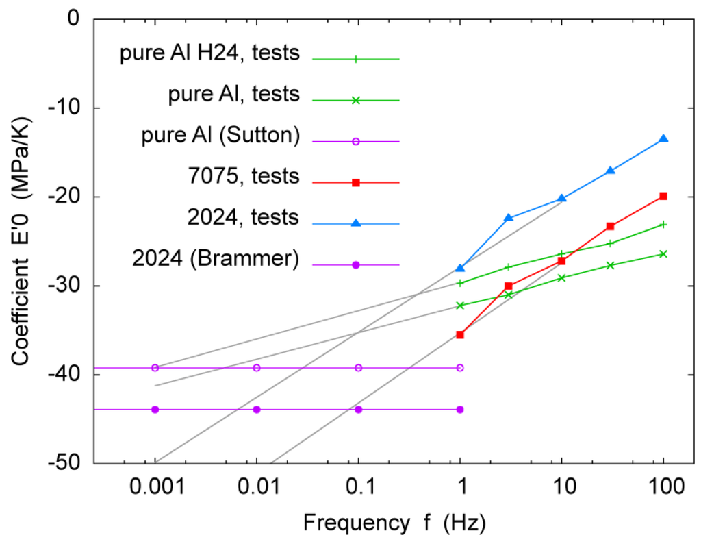 Temperature softening coefficient E0’ vs. frequency f for pure Al in the H24 temper, pure Al, Al alloy (AA) 7075-T6 and AA 2024-T3, as obtained from linear regression of test data from the dynamic-mechanical analyzer. Logarithmic tendency lines fitted to the data to extrapolate them to lower frequencies are also shown, as well as the rates of loss of static elastic modulus with temperature, as obtained by linear regression of data in the literature for pure Al [] and AA 2024 [].