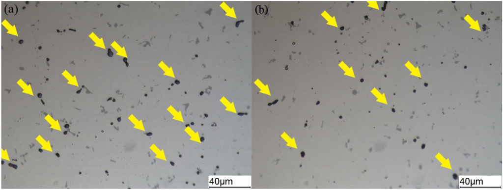 Optical micrographs show second-phase particles located in the matrix of (a) T6; (b) CFT6a sample; non-etched cross-section in transverse direction.