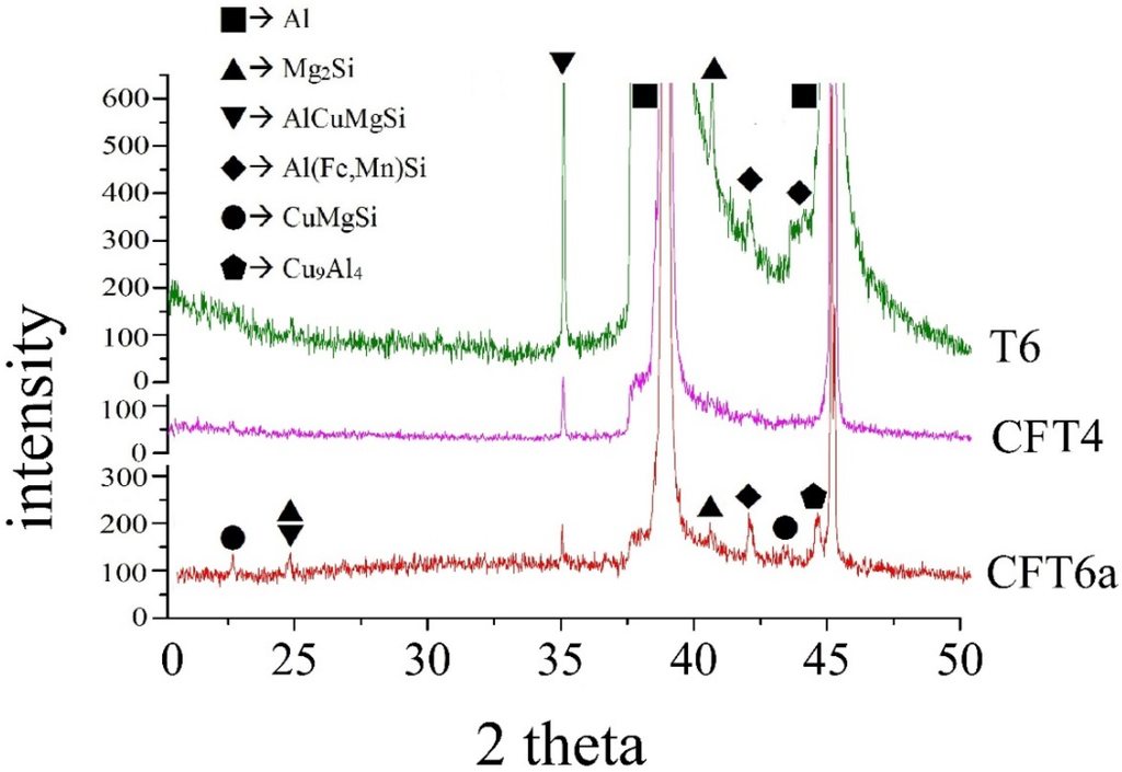 The T6 sample comprised α-Al, Q-(AlCuMgSi), Al(Mn,Fe)Si, and some Mg2Si phases, as shown in Figure 4. After solution treatment, the cryoforged sample was tested and indicated that SP/IMC particles were highly dissolved in its matrix, as confirmed by the CFT4 sample in Figure 4. After artificial aging, the intensity of the Q phase was notably decreased, presenting complex phases of Mg2Si, Q-(AlCuMgSi), and Al(Mn,Fe)Si, as well as some Cu9Al4 and CuMgSi phases; see CFT6a sample. Kim et al. annealed copper wire and an aluminum pad at 150 to 300 °C and found a Cu9Al4 phase with an X-ray spectra peak at 43.9° [19].
