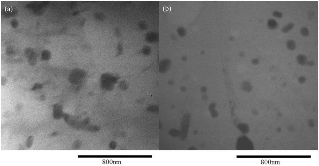 The CFT6a sample increased the HAGBs in its matrix to provide more potent sites for accommodating Cu atoms after the solution treatment. During quench or aging in room temperature, Cu diffused to tie up with Al forming Cu9Al4 phase. During artificial aging, a Mg–Si cluster formed in situ; this either led to the formation of CuMgSi precipitates through movement of the Cu atoms, or the Cu–Mg clusters formed first and subsequently incubated the CuMgSi precipitate in the matrix. Figure 5a,b shows the transmission electron microscopy photos of the T6 and CFT6a samples, respectively. For a given solution and aging conditions, the CFT6a sample achieved finer precipitates (less than 100 nm) than the T6 sample did. The main constituted phases likely included Al(Mn,Fe)Si in block and plate shapes, and some fine particles (less than 100 nm) likely being Cu9Al4 and CuMgSi precipitates or Cu atoms surrounding fine Mg2Si phases, as shown in Figure 5b. The α-Al(Mn,Fe)Si dispersoids could have a block-shaped or plate-shaped morphology in the size of 50–200 nm, as reported by Li et al. [24].