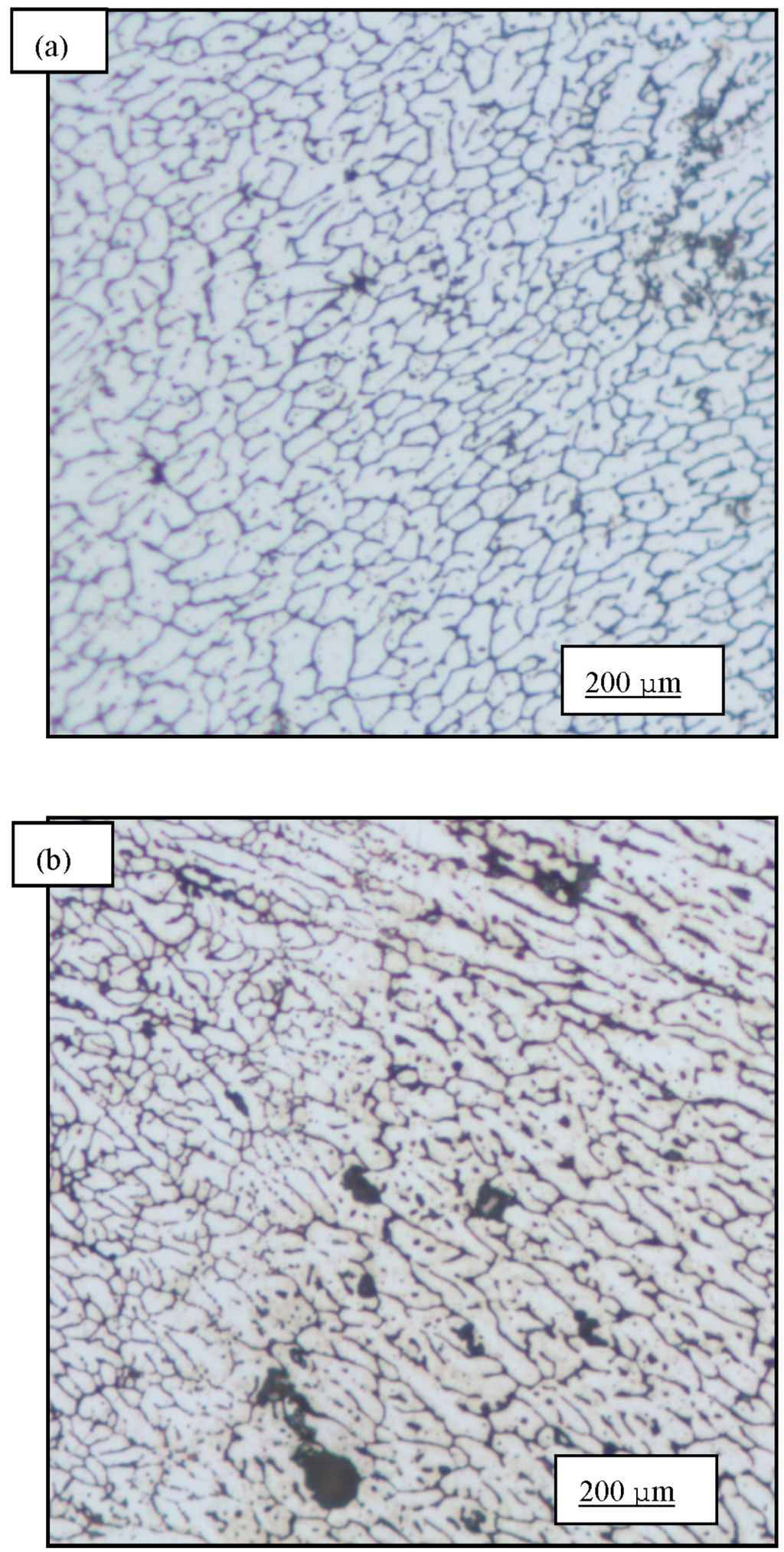 Optical micrographs of AA6061 showing the following: (a) Distribution of intermetallic particles in the base metal adjacent to the weld bead; and (b) microstructure of the weld pool of the heat-treated alloy.
