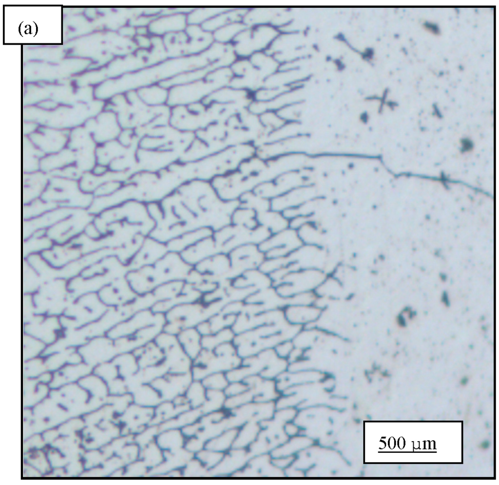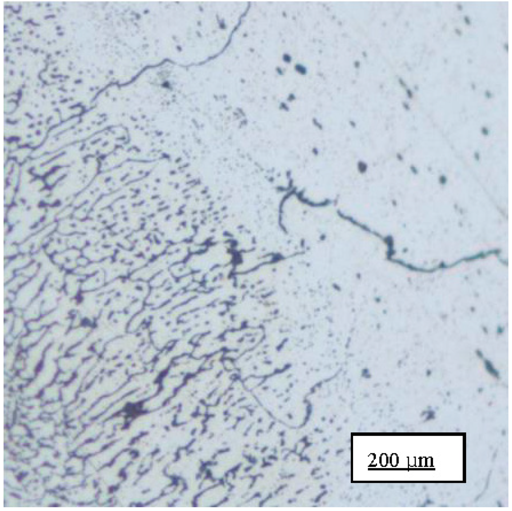 Light optical micrographs were taken over a range of low magnifications, revealed the initial microstructure of AA6061 in the (a) as-received (AR); (b) as-welded (AW); (c) as-received plus precipitation heat treated (AR+PHT); and (d) post weld heat treated (PWHT) conditions. The as-received alloy revealed a random distribution of both coarse and intermediate size intermetallic particles (Figure 3a,b). These intermetallic particles result from the presence and availability of residual elements, such as iron and silicon [18,19]. As documented elsewhere, these particles were identified to be Al12Fe3Si, Al15(FeMn)3Si and Al5FeSi [18,19,20]. The iron-rich intermetallic particles range in size from 1 to 10 microns and are potential sites for the early initiation of microscopic damage during plastic deformation. The manganese-rich particles in the chosen aluminum alloys help in controlling both grain size and grain growth during solidification. Micrographs of the alloy in the as-welded (AW) condition revealed fine recrystallized grains in the region of the weld bead (Figure 4a). By comparison, the weld bead in the post weld heat treated condition is shown in Figure 4b. A noticeable difference in microstructure between the weld bead and base metal is evident along the interface between the two regions (Figure 5a,b). The microstructure of aluminum alloy 6061, in the as-received plus precipitation heat treated condition revealed a significant volume fraction of both coarse and intermediate size second-phase particles in the base metal (Figure 6a). These particles were randomly dispersed throughout the microstructure. The as-welded and post weld heat treated samples revealed very well defined grains that could be classified as being: (i) small in size and of varying shape (Figure 6b), and (ii) distributed randomly through the microstructure of the base metal. The microstructure at the interface of the base metal and weld bead is shown in Figure 12. Fine microscopic cracks are evident and can be attributed to melting of the low melting point constituents both at and along the grain boundaries.