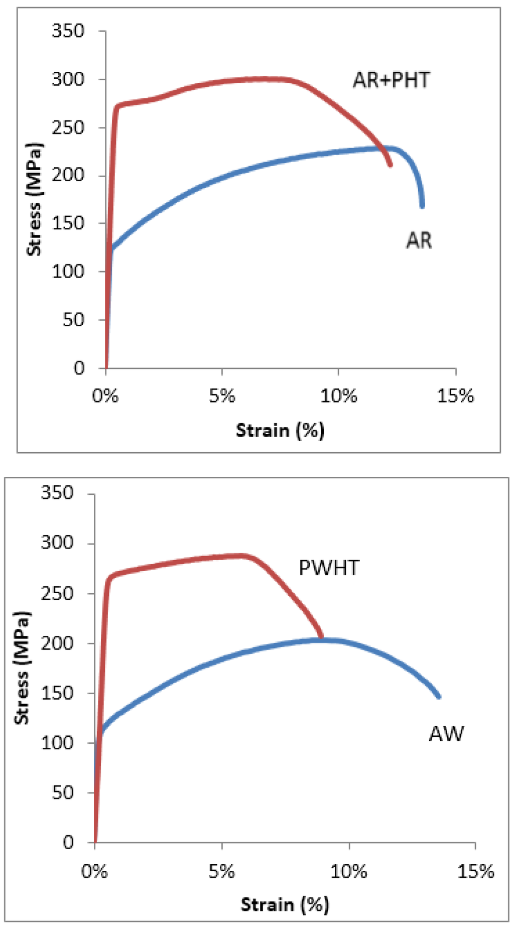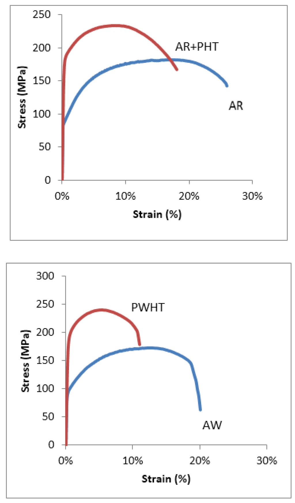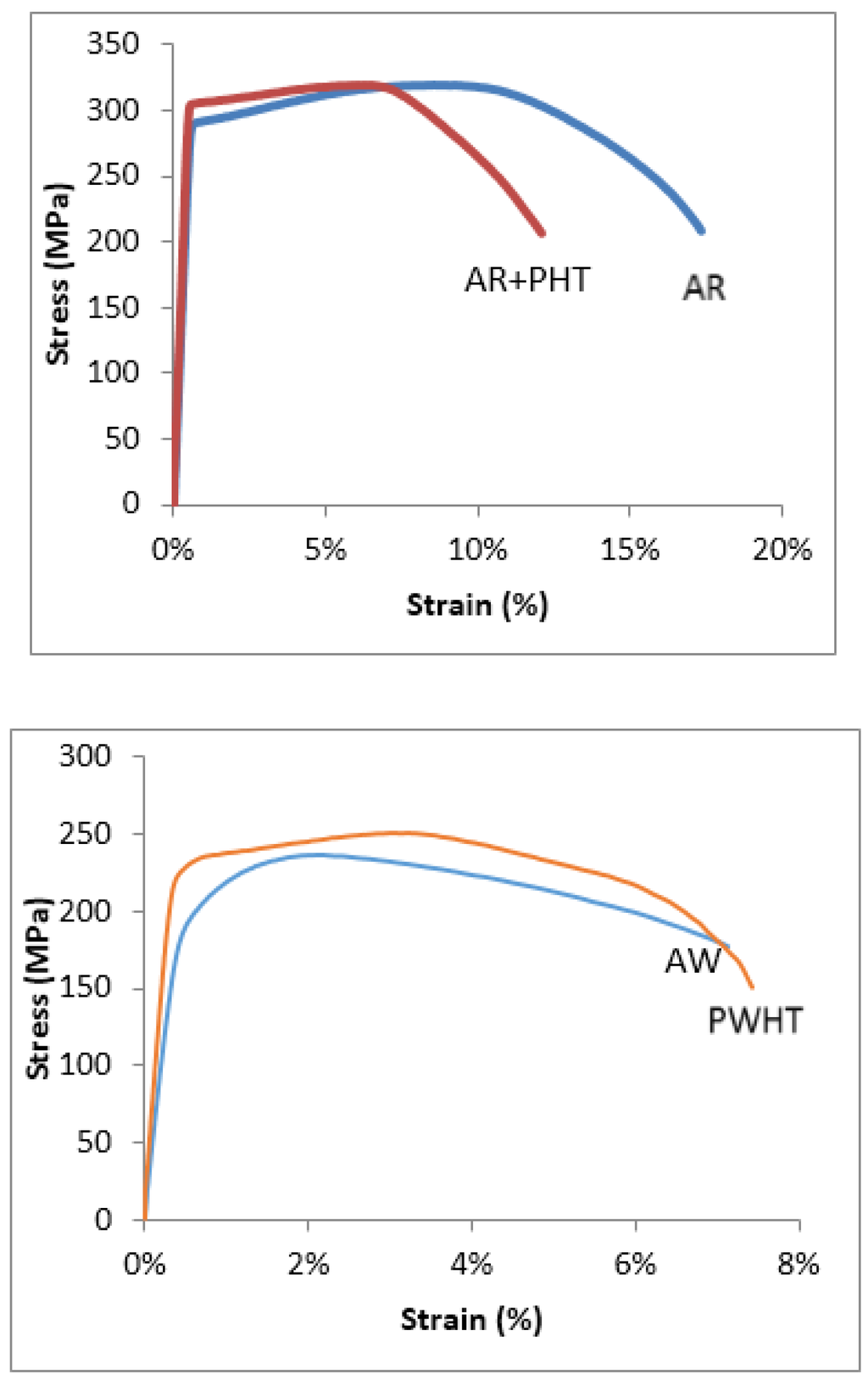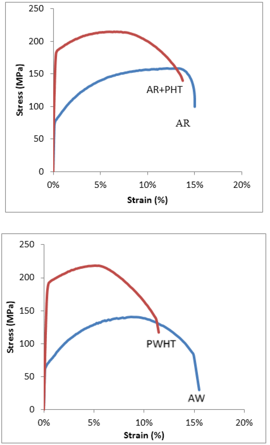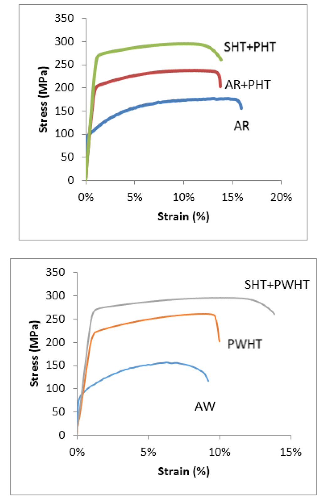 In Figure 7, Figure 8, Figure 9, Figure 10 and Figure 11 the typical stress versus strain behaviors for the aluminum alloys and test conditions employed used this study are shown. Each plot shows the stress versus strain variation for either the as-received (AR) and as-received and aged (AR+PHT) or the as-welded (AW) and the Post Weld Heat Treated (PWHT) counterpart. Figure 11, shows the stress versus strain response for the re-solution heat treated and aged 6005A (SHT+PHT or SHT+PWHT).