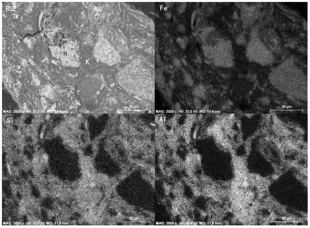Representative SEM-BSE micrographs of high-aluminum hematite-limonite ore. (BSE, Back Scattered Electron Imaging; H, hematite; K, kaolinite).