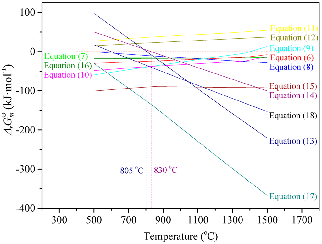 Calculations of Gibbs energy changes of Equations (6)–(18) by FactSage7.0.