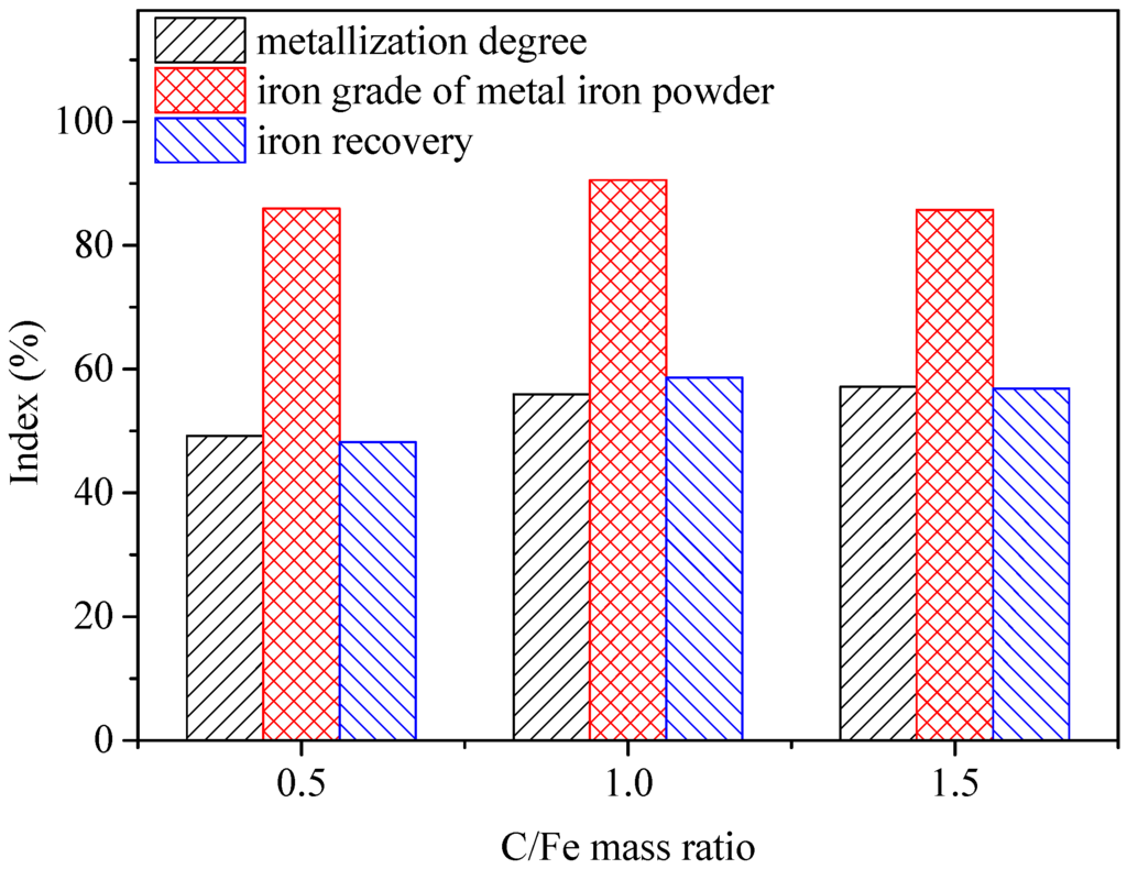Effect of C/Fe mass ratio on the reduction and separation indexes (reducing at 1300 °C for 20 min).