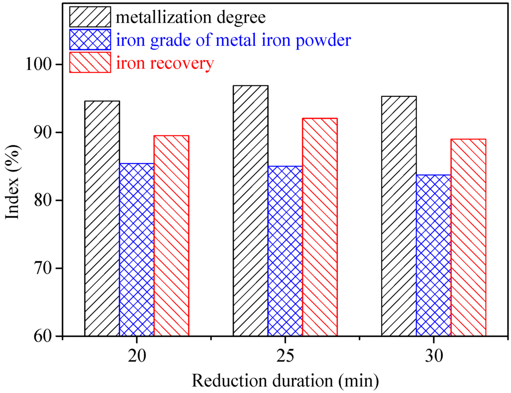 Figure 11 presents the effect of reduction duration on the indexes of the reduction and separation processes, which shows that the metallization degree and iron recovery were enhanced by prolonging the reduction duration from 20–25 min. Further extension of the reduction time had a slightly negative impact on the indexes. Therefore, reducing at 1350 °C for 25 min was recommended, where the metal iron powder was manufactured with 85.00% of iron grade at a recovery of 92.05%, respectively.
